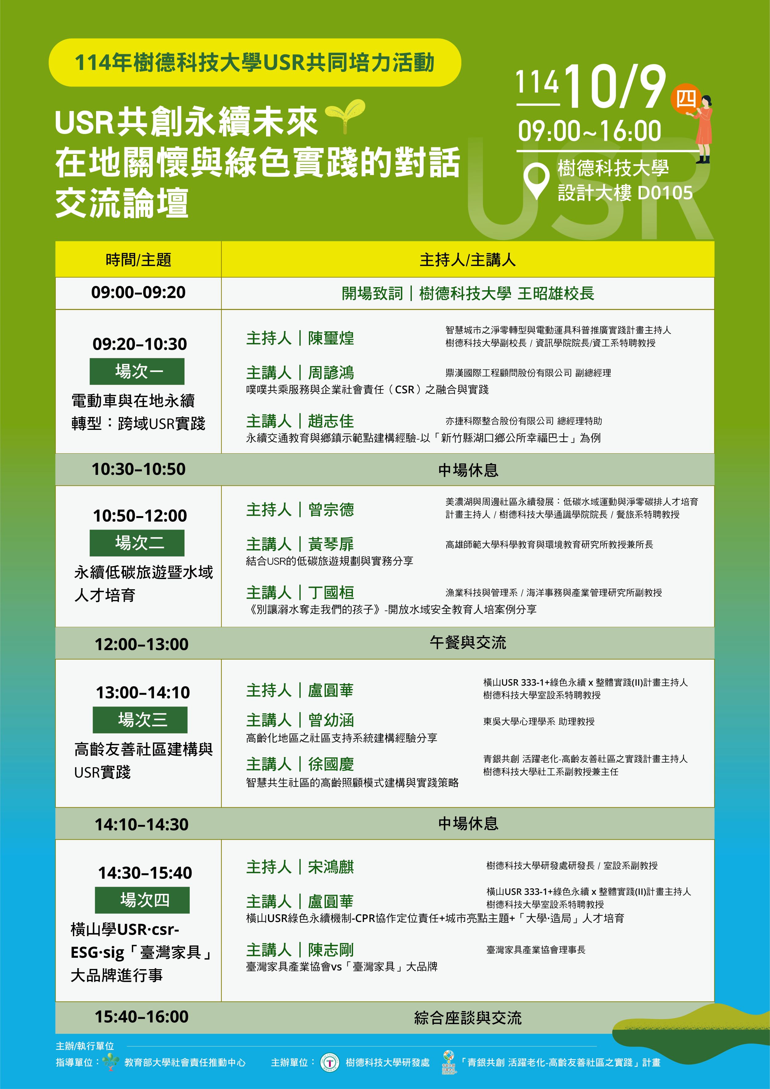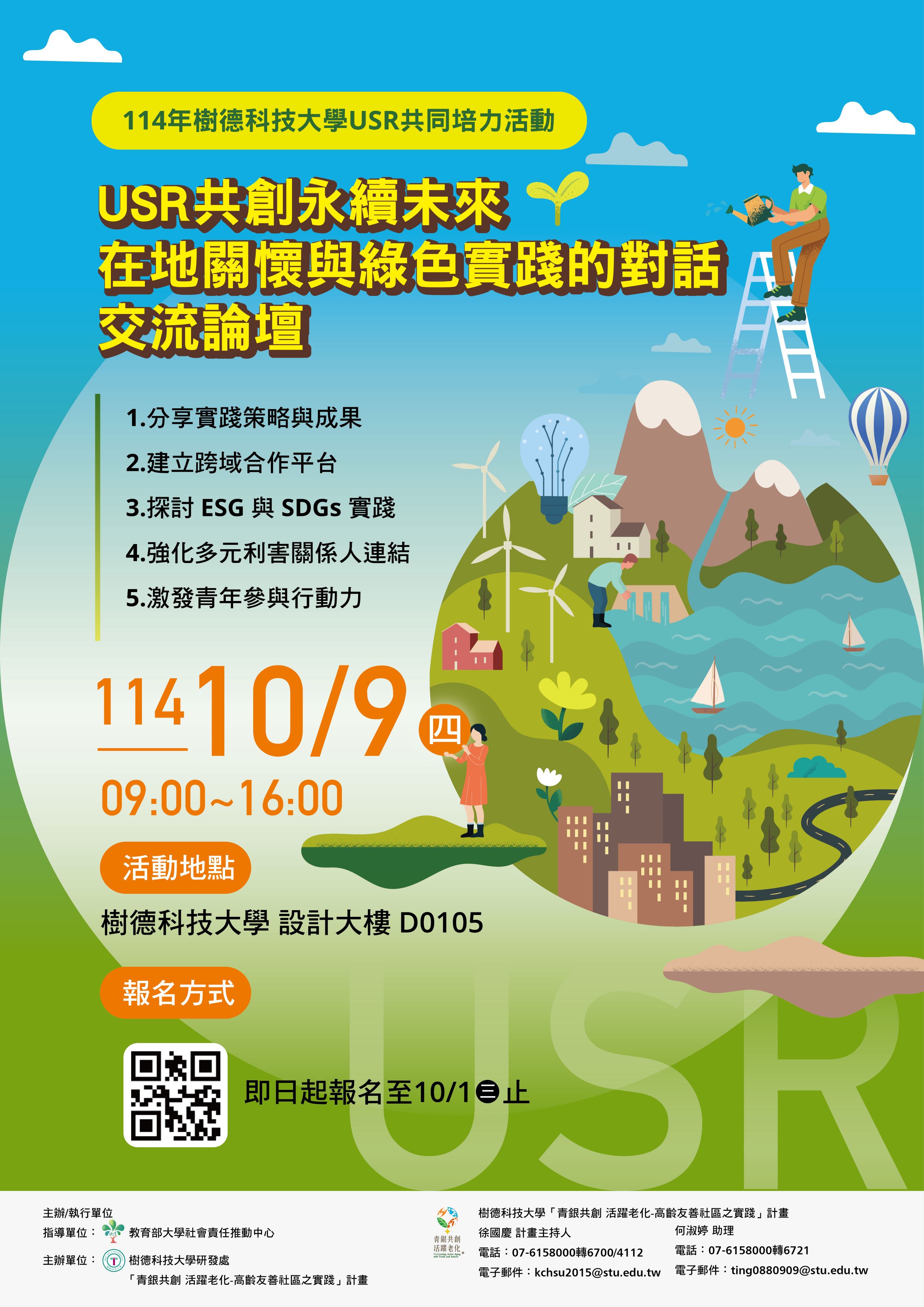 【USR活動轉知】有關樹德科技大學於114年10月9日(星期四)辦理「SIG共培活動《USR共創永續未來-在地關懷與綠色實踐的對話》交流論壇」
